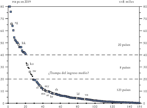 Como se observa en la Gráfica 1, desde la posguerra sólo 10 de 151 países incluidos en la base de datos de las Perspectivas de la Economía Mundial del Fondo Monetario Internacional (FMI) han logrado pasar el umbral de 20 000 dólares per cápita, y de esos 10, cuatro pertenecen a los NIC-1 y seis a la periferia europea. Lo que más llama la atención en la gráfica es la pronunciada pendiente de la curva del ingreso por encima de 10 000 dólares per cápita. De hecho, 123 de los 151 países se encuentran por debajo de 20 000 dólares, y sólo ocho han logrado pasar al rango de ingreso per cápita entre 20 000 y 40 000 dólares. Esto es, si bien en dicho periodo muchos países han hecho la transición del estatus de ingreso bajo al de ingreso medio, muy pocos han tenido éxito en su esfuerzo por acercarse a la frontera productiva.