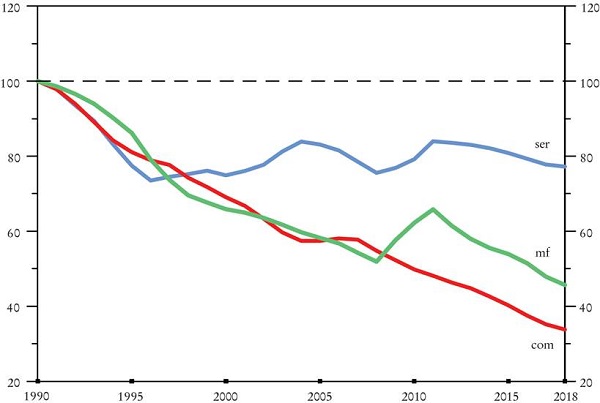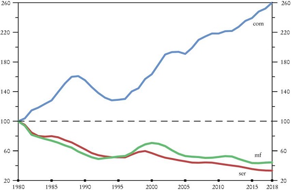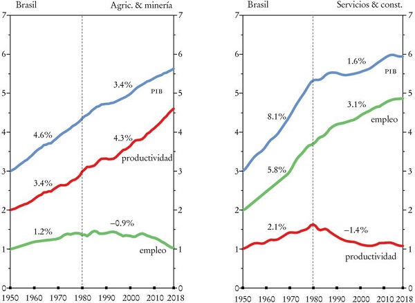 Aunque el crecimiento del sector servicios normalmente se correlaciona con el de no servicios, Kaldor sugiere que existe una causación circular inversa: el crecimiento del ingreso y el de la manufactura elevan la demanda por servicios con alto valor agregado. En Brasil, por ejemplo, durante el periodo del rápido crecimiento de la manufactura entre 1950 y 1980, el crecimiento de la productividad en servicios cerraba brechas productivas con la frontera; no obstante, el colapso del crecimiento de la productividad manufacturera después de 1980 arrastró al de los servicios (Palma, 2012b y 2019b).