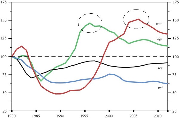 La continua desaceleración del crecimiento de la productividad, precipitada por el cambio en la política monetaria en 1998, se debió principalmente al fracaso de su élite empresarial, la inversión extranjera y el gobierno para reactualizar la estrategia “extractivista” cuando ésta cumplió su ciclo (véase también más adelante). La contribución del crecimiento de la productividad al crecimiento del PIB cayó de 54% durante el periodo de rápido crecimiento (1986-1998) a apenas 14% desde 2008 a 2019.