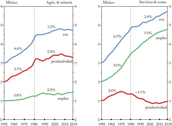La situación es más grave en América Latina, la cual ha tenido un desempeño pobre no sólo en comparación con los países avanzados y los nuevos países industrializados de Asia (los NIC-1), sino también en relación con los NIC-2 del Sudeste Asiático. Los países de América Latina han seguido un “modelo extractivo dual” con base en una combinación donde la extracción de productos primarios para la exportación es la única actividad que genera crecimiento de la productividad, mientras que los servicios tienen toda la tarea de crear empleo. Más aún, como en la mayoría de los países el crecimiento de la productividad en la extracción de materias primas se ha desacelerado a medida que estas actividades ya se hacen competitivas internacionalmente (excepto Brasil, a costa de la devastación del Amazonas), el crecimiento de la producción se ha restringido cada vez más a la tasa de crecimiento del empleo de bajos salarios en servicios y construcción, y en México con el TLCAN, también a la maquila y la industria ensambladora.