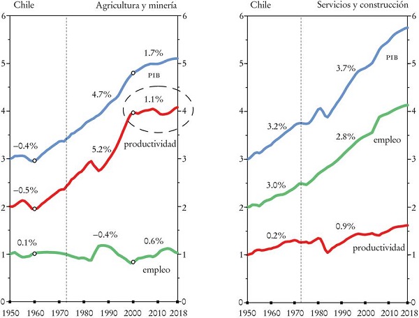 Desde mediados de los años ochenta es la agricultura (incluyendo la silvicultura, la acuacultura, las frutas y las verduras, así como el vino) la que lidera la recuperación de la crisis financiera de 1982, el crecimiento de la productividad y el cierre de brechas productivas en Chile. Sin embargo, una década más tarde este sector productivo perdió su impulso y fue la minería que pasó a ser la que cierra brechas productivas con la frontera. Sin embargo, aproximadamente una década después la minería también perdió su empuje, pero ya no hay otro sector que tome su lugar como motor del crecimiento de la productividad.