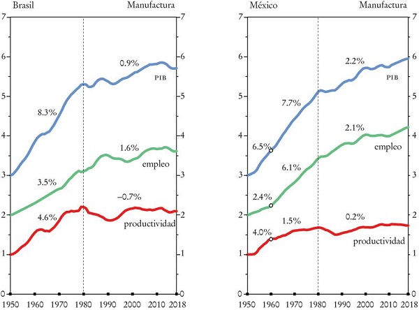 Además, como el crecimiento de la productividad manufacturera se estancaba en estos dos países y en Argentina, el nivel actual de la productividad promedio de la persona trabajadora en manufactura en estos tres países (como sucede con el promedio latinoamericano) no es mayor de lo que era en el momento de la crisis de la deuda en 1982. De hecho, en Brasil y Argentina los niveles actuales de productividad son similares a los que ya se registraron a mediados de los años setenta.