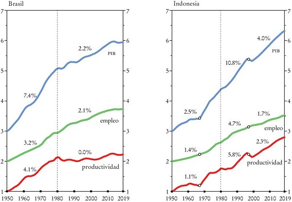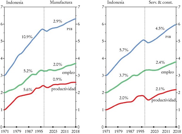 Como ocurrió en Tailandia, el PIB y la productividad de Indonesia aumentaron a una tasa sorprendente hasta la crisis de 1997. El PIB se multiplicó por un factor de ocho y la productividad promedio del trabajo se triplicó desde finales de los años sesenta hasta 1997. La contribución de la productividad al crecimiento del PIB también se ha incrementado en Indonesia con el transcurso del tiempo: de 44% durante el gobierno de Sukarno desde su independencia (1950) hasta 1966; 55% desde el inicio del gobierno militar de Suharto hasta la crisis financiera de 1997, y 58% a partir del comienzo del periodo que siguió a Suharto hasta 2019. El crecimiento de la productividad se desaceleró después de 1997 hasta llegar a menos de la mitad del periodo previo por las razones que se trataron antes, aunque el nivel promedio de la productividad era sólo un quinto del de los Estados Unidos.