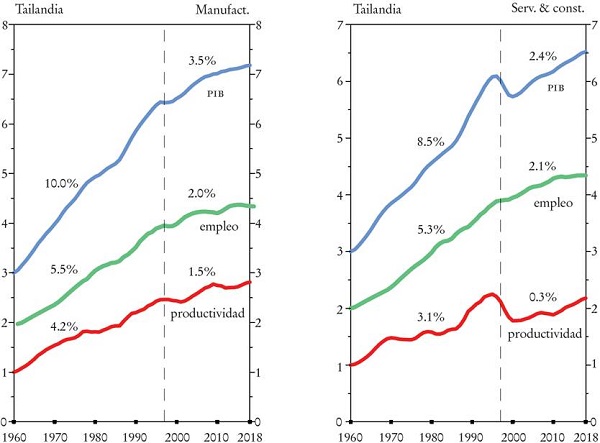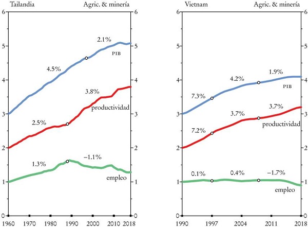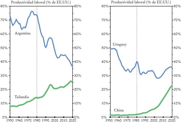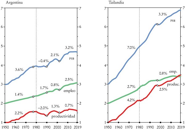 El desempeño de Argentina contrasta claramente con el de Tailandia, que al menos hasta la crisis financiera de 1997 tuvo un crecimiento impresionante de la producción y de la productividad del trabajo. De hecho, entre 1950 y 1997 multiplicó su PIB por un factor de 24 y la productividad por siete. Las estadísticas de Argentina para el mismo periodo fueron tres y 3.1, respectivamente. A pesar de la desaceleración desde su crisis financiera, la productividad promedio en Tailandia se ha más que duplicado desde 1997 (aumentó por un factor de 2.5), mientras que la productividad promedio de Argentina no se incrementó. Además, en Tailandia la contribución de la productividad de la mano de obra al crecimiento del PIB ha ido en aumento: entre 1950 y 1980 la productividad contribuyó con casi 60% del crecimiento del PIB; de 1980 a 1997 fue 70%, y de 1997 a 2019 llegó a 76%. La desaceleración del crecimiento de la productividad tailandesa, después de la crisis financiera -lo que evidencia un posible encuentro temprano con la trampa del ingreso medio- siguió un patrón similar al de Malasia e Indonesia.