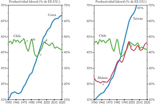 Corea y Taiwán, en cambio, como muestra la Gráfica 2 y al igual que los otros NIC-1, no mostraron señales de vértigo cuando superaron dicho nivel de 50% de la productividad de la frontera. En Singapur, por ejemplo, el contraste es extremo: en el momento de su independencia en 1965 tenía la misma posición de productividad en relación con los Estados Unidos que Chile; 28 años más tarde, ya había superado el nivel de productividad promedio de los Estados Unidos, mientras que Chile había incluso caído por debajo de la posición relativa que tenía en 1965.