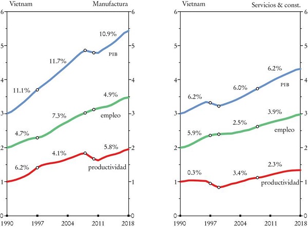Por su parte, el mejor desempeño de los servicios en Vietnam (en términos relativos, aún más que en manufacturas, agricultura o minería) se debe en gran medida a un considerable desarrollo del turismo, lo cual necesitó inversión en una amplia gama de servicios relacionados, y al rápido desarrollo de los servicios de apoyo para las operaciones de ensamblaje, como el transporte y la logística.