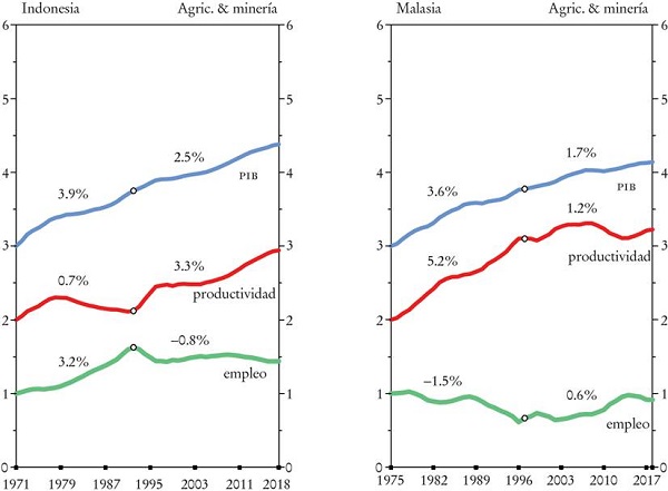 El rápido crecimiento de las manufacturas y los servicios atrajo a trabajadores subempleados de la agricultura a pequeña escala, lo cual ha contribuido a estabilizar el crecimiento de la productividad en el sector primario, a pesar de una desaceleración del crecimiento de la producción.