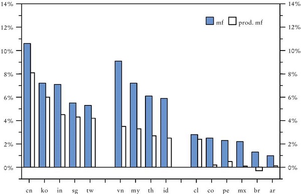 La teoría ortodoxa del comercio internacional -tanto la nueva como la antigua- predecía que la liberalización del comercio y la mayor competencia del Asia emergente (abundante en mano de obra barata) afectarían más las actividades manufactureras (o segmentos de las cadenas de valor) latinoamericanas que utilizan intensivamente la mano de obra que a las de mayor nivel de productividad laboral. Mientras las primeras tenderían a transferirse a Asia, la región tendería a retener a las segundas. A su vez, la manufactura que quedaría, por estar más concentrada en actividades más dinámicas y de mayor valor agregado, debería generar un crecimiento más rápido de la productividad promedio de la industria por la especialización y los rendimientos crecientes.