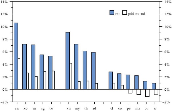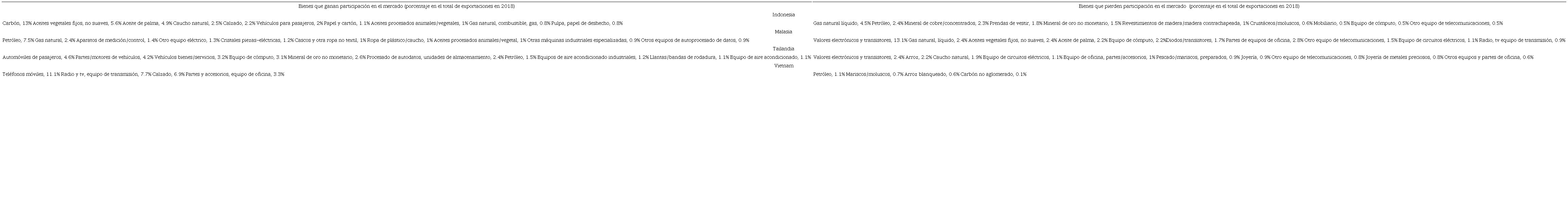 Indonesia y Malasia, mientras tanto, perdían terreno en mercados exportadores, y Tailandia lograba un pequeño aumento en su participación en las exportaciones manufacturadas mundiales gracias a su éxito en componentes de vehículos y automóviles (Cuadro 1).