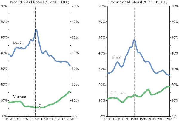 A pesar de disfrutar de acceso preferencial al mercado de los Estados Unidos desde los años ochenta, y acceso pleno desde 1990, y de recibir la mayor proporción de IED en el mundo en relación con su fuerza de trabajo, México es otro caso latinoamericano de estancamiento de la productividad desde 1980.9 Así, hoy en día la productividad del trabajador promedio en Argentina, Brasil y México -que, después del colapso de la economía venezolana representan en conjunto más de 80% del PIB de América Latina- es la misma que hace cuatro décadas. En ese mismo tiempo, en China la persona trabajadora promedio ha multiplicado su productividad por más que un factor de 20; en la India por más que un factor de seis; en Corea, Taiwán y Vietnam por cinco; Tailandia por cuatro, y en Indonesia y Malasia por tres. Incluso Chile, que ha tenido el mejor desempeño en América Latina, ni siquiera ha logrado duplicar la productividad promedio del trabajo que tenía hacia el final del periodo sustitutivo (en 1971) (The Conference Board, 2021).