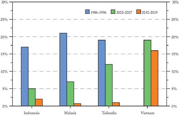 La desaceleración económica posterior a 1997 llevó a un fuerte descenso en la inversión pública y la privada en Indonesia, Malasia y Tailandia, las cuales se mantuvieron en niveles muy bajos durante las próximas dos décadas (Palma y Pincus, 2022). Mientras tanto, Vietnam navegó mucho mejor los efectos de la crisis financiera asiática, ya que amortiguó por una cuenta de capital cerrada y una baja deuda externa.