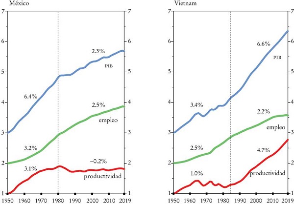 El contraste entre México y Vietnam es incluso más impresionante (Gráfica 8). Ambos países se transformaron en plataformas de ensamblaje para empresas manufactureras extranjeras. En México ha sido gracias a su cercanía con los Estados Unidos y a los acuerdos comerciales que le han dado acceso pleno al mercado estadunidense; en Vietnam, debido a los bajos salarios, la estabilidad política, la cercanía a China y los progresos en la infraestructura del país.