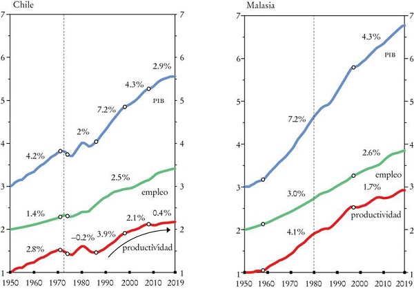 Excepto por el crecimiento (temporal) de las actividades extractivas, el rendimiento mediocre de América Latina desde 1980 se concentra en el poco crecimiento de la productividad del trabajo. De hecho, el crecimiento del PIB en la América Latina después de 1980 -con la excepción de Chile durante un periodo relativamente breve (1986-1998)- puede atribuirse casi en su totalidad al crecimiento del empleo, pues el nivel de producto promedio por persona trabajadora se ha mantenido virtualmente estancado durante cuatro décadas (Palma, 2010 y 2019c). En otras palabras, como las tasas de crecimiento del empleo en América Latina y los NIC-2 han sido similares, la disparidad en las tasas de crecimiento del PIB en ambas regiones se debe casi exclusivamente a los diferenciales en el crecimiento de la productividad.