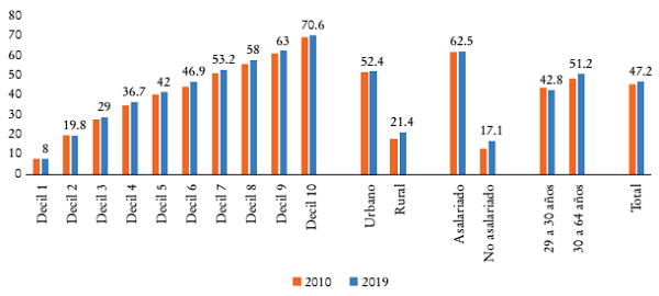 En 2019 más de la mitad de las personas ocupadas no estaban afiliadas ni cotizaban en un sistema de pensiones. Pese a los esfuerzos realizados en algunos países para extender la cobertura a trabajadores independientes e informales, así como a las trabajadoras domésticas, esta cifra en buena medida refleja la extendida presencia de la informalidad laboral y la debilidad de los mecanismos de fiscalización de la evasión y elusión previsional. Además, si bien se redujeron levemente en la última década, persisten múltiples desigualdades en la afiliación y la cotización a los sistemas de pensiones, sea por deciles de ingresos, asalarización, residencia en zonas rurales o urbanas o edad (véase Gráfica 10) (CEPAL, 2021c).