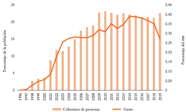 Por el lado de la protección social no contributiva, la región ha experimentado un aumento de la cobertura, principalmente mediante la expansión de los programas de transferencias condicionadas (PTC) y las pensiones no contributivas para adultos mayores y personas con discapacidad. Para los PTC esta expansión ha ocurrido desde mediados de los años noventa hasta 2010, cuando se alcanzó un máximo de cobertura de 23.1% de la población total de la región. En 2019 los PTC alcanzaban a 22.6% de la población regional con un gasto de 0.27% del PIB (véase Gráfica 11). Sin embargo, los programas no contributivos generalmente ofrecen prestaciones de montos relativamente bajos: alrededor de 2013 el monto per cápita mensual de las transferencias monetarias condicionadas recibidas por los hogares variaba entre 1.2% (en el Estado Plurinacional de Bolivia) y 46% (en Uruguay) de la línea de pobreza (CEPAL, 2015). Asimismo, estos programas atienden principalmente a la población que vive en situación de pobreza, mientras que se sabe que amplios sectores de la población experimentan altos niveles de vulnerabilidad y necesitan de protección.