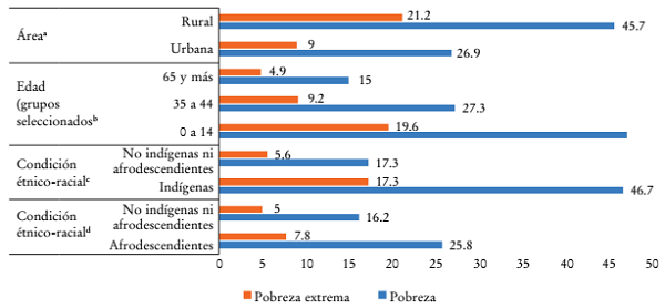 Una manera de visualizar cómo opera la matriz de desigualdad social en la región es mediante la observación de que la incidencia de la pobreza y la pobreza extrema difiere según sus distintos ejes estructurantes. Por ejemplo, la pobreza es mayor entre las mujeres en edad activa: en 2019 la tasa de pobreza fue 12.7% mayor entre éstas que entre los hombres de edad similar, como lo indica un índice de feminidad de la pobreza de 112.7. Asimismo, la incidencia de la pobreza y la pobreza extrema es mayor en las áreas rurales, entre las personas indígenas y la población afrodescendiente, las niñas, los niños y los adolescentes respecto al resto de la población (véase Gráfica 2) (CEPAL, 2021c).