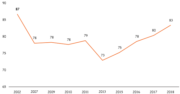 Finalmente, cabe destacar que la alta desigualdad del ingreso en América Latina se combina con altos niveles de injusticia percibida. En 2018, 83% de la población de la región consideró que la distribución del ingreso era injusta o muy injusta, percepción que, a escala nacional, fue superior a 90% en Argentina, Brasil, Chile y la República Bolivariana de Venezuela. A escala regional este indicador experimentó una tendencia a la baja entre 2002 y 2013: de 87 a 73%, para luego subir hacia 2018 (véase Gráfica 4). Este aumento coincide con la desaceleración de la reducción de la desigualdad del ingreso (CEPAL, 2021b).