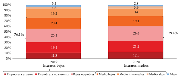 Para dar cuenta de la vulnerabilidad a la que está sometida la población en los países de la región, la CEPAL (2019c) ha desarrollado una metodología para la medición de la estratificación socioeconómica basada en umbrales absolutos de ingreso, expresados en múltiplos de las líneas de pobreza. Si bien se reconoce que la discusión acerca de la estratificación social y, en particular, sobre las clases sociales conlleva muchas dimensiones (ocupación, educación, ingresos y gastos, consumo material y simbólico, redes sociales e identidades, entre otras), la CEPAL (2019c) aborda los cambios en la estructura socioeconómica en términos del tamaño de los diversos estratos definidos por diferentes umbrales de ingreso per cápita.