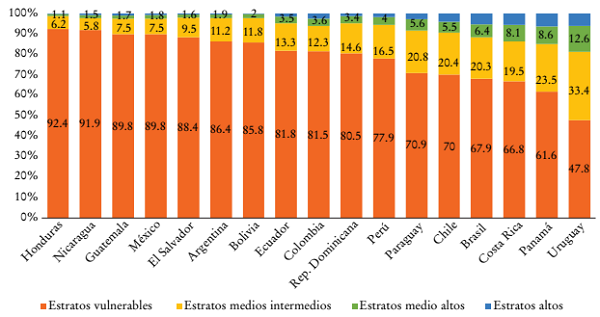 Estratos de ingreso medio fuertes y prósperos son cruciales para cualquier economía exitosa y sociedad cohesionada, pues sostienen una parte considerable del consumo y la inversión en educación, salud y vivienda, y desempeñan un papel clave en el apoyo a los sistemas de protección social mediante sus contribuciones tanto a la seguridad social como al fisco (CEPAL, 2021c). Sin embargo, en América Latina no se cuenta con extensos sectores de ingresos medios consolidados, caracterizados por tener acceso a trabajos formales y a la protección social, a diferencia de lo que ocurre en economías más avanzadas y con Estados de bienestar más desarrollados. Más bien, en la región amplios estratos de la población tienen una inserción laboral informal, y escasa o nula protección social. Esto hace que los estratos de ingreso medio no incluyan a la mayoría de la población y que muchos vivan en la pobreza o sean muy vulnerables a caer en ella cuando son golpeados por choques de distinta índole (Cecchini, Espíndola, Filgueira, Hernández y Martínez, 2012), como la pandemia de la Covid-19.