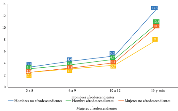 A su vez, el mercado de trabajo ofrece un ejemplo claro del entrecruzamiento de las desigualdades de género y las étnico-raciales. En la Gráfica 8 se evidencia que los retornos educacionales en términos de ingreso laboral de las mujeres en relación con los hombres, y las personas afrodescendientes respecto de las no indígenas ni afrodescendientes son significativamente inferiores. En otras palabras, la gráfica muestra que, con los mismos niveles de escolaridad, las mujeres, las personas afrodescendientes y, especialmente, las mujeres afrodescendientes reciben ingresos laborales significativamente inferiores. Asimismo, puede observarse que esa diferencia es más significativa entre aquellos que cuentan con más de 12 años de educación. Lo anterior expresa la persistencia de mecanismos tanto de discriminación como de segmentación ocupacional por género y condición étnico-racial en el mercado de trabajo (CEPAL, 2016b, 2018b y 2019a).