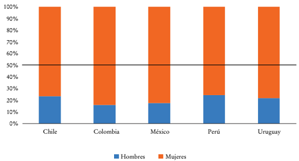 Las desigualdades de género en el mercado laboral se relacionan con que las mujeres en la región son las principales proveedoras de trabajo de cuidado no remunerado en los hogares (véase Gráfica 9). Frente a la debilidad de las políticas públicas de cuidado en la región, la persistencia de la división sexual del trabajo no remunerado constituye un obstáculo para su plena incorporación al mercado de trabajo y para la realización de sus proyectos de vida, que podría superarse con una distribución más equitativa de las labores de cuidado entre hombres y mujeres en los hogares (CEPAL, 2019c).