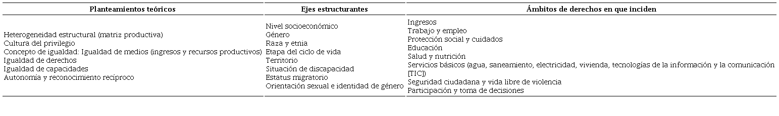 El primer eje de la matriz de la desigualdad social es el estrato socioeconómico, cuyos elementos centrales incluyen los ingresos, la propiedad y los recursos y activos productivos y financieros. Pero si se parte de un concepto amplio de desigualdad, se plantea que los ejes estructurantes de la matriz de desigualdad social incluyen, además del estrato socioeconómico, las desigualdades de género, las étnicas y raciales, las territoriales y aquellas relacionadas con las diferentes etapas del ciclo de vida de las personas, incluyendo también dimensiones como la discapacidad, el estatus migratorio, la orientación sexual y la identidad de género. Lo que confiere a cada uno de estos ejes el carácter estructurante en la configuración de las desigualdades sociales es su impacto sobre la magnitud y la reproducción de las desigualdades en distintos ámbitos del desarrollo y del ejercicio de los derechos (CEPAL, 2018b): ingresos; trabajo y empleo; protección social y cuidados; educación; salud y nutrición; servicios básicos; seguridad ciudadana y vida libre de violencia, y participación y toma de decisiones (véase Cuadro 1).