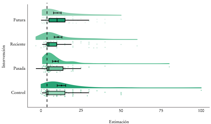 Una de las preguntas que más nos interesa es el efecto que tiene la provisión de información (intervenciones) sobre las expectativas de inflación de los encuestados (pregunta 6 en el cuestionario). La Gráfica 1 muestra estas expectativas e incluye la distribución, el rango intercuartil (distribuciones de caja), la mediana (la línea negra vertical dentro del diagrama de caja) y el promedio con su intervalo de confianza a 95% (en negro dentro de la distribución) para cada grupo de tratamiento y para el grupo de control. Esta representación visual de los datos se conoce como gráfico de “nubes de lluvia” (Allen et al., 2021), la cual resume muy bien la dispersión y los diferentes momentos de los datos. El Cuadro 3 muestra las estadísticas descriptivas.