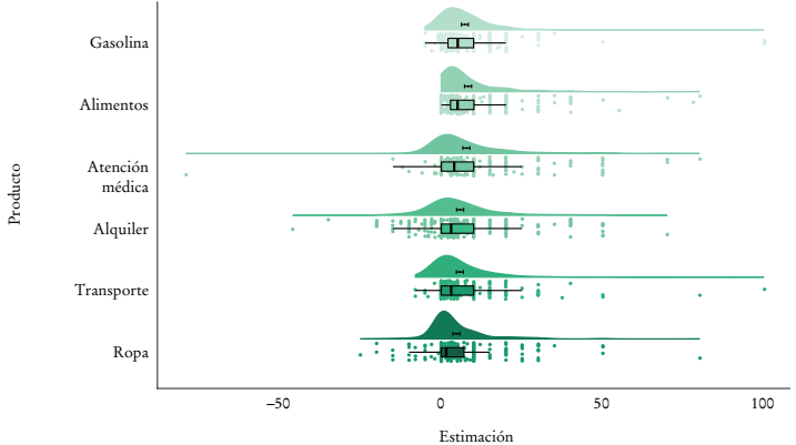 La Gráfica 2 integra los resultados para la predicción de inflación de los diferentes productos. Los incluidos en la encuesta son: gasolina, alimentos, atención médica, alquiler, transporte y ropa. En esta gráfica y en la 1 aparecen los mismos tipos de diagrama. Las estimaciones están principalmente en el centro de la gráfica (mayores a cero, pero no muy alejadas de este valor); las distribuciones están sesgadas hacia la derecha, y el rango y la dispersión de los datos varían entre productos. Especialmente en la pregunta sobre la atención médica vemos que, a pesar de tener datos extremadamente atípicos tanto a la izquierda como a la derecha, en su mayoría están muy concentrados en un intervalo mucho más pequeño (véase su diagrama de caja). Debido a estos extremos, también implementamos regresiones cuantiles en la mediana a fin de estimar el peso que tienen estos productos sobre la expectativa de inflación.
