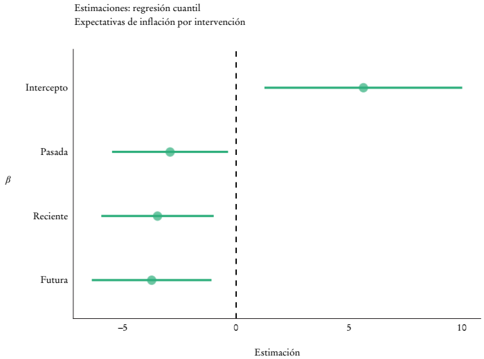 La Gráfica 3 muestra el resultado de la estimación de la ecuación (1). Incluye una línea punteada para señalar el cero. La estimación muestra claramente que la provisión de información adicional contribuye a reducir las expectativas de inflación. La intervención es estadísticamente significativa, ya que el intervalo de confianza no toca la línea punteada sobre cero. Debido al bajo tamaño de la muestra, existe incertidumbre sobre cuánto realmente puede reducirse la expectativa de inflación. Los intervalos señalan que el rango va de -1 a -6 puntos porcentuales, dependiendo de la intervención. En promedio, las intervenciones reducen en 3.4 puntos porcentuales la expectativa de inflación cuando no se provee ninguna información (en la mediana). De hecho, el Cuadro 3 muestra que la mediana de las expectativas de inflación en el grupo de control es 10%, mientras que en el resto de las intervenciones es 5% o menos.