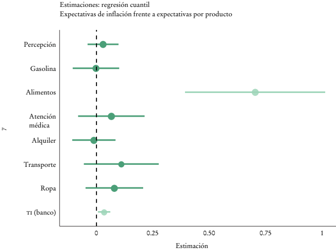 El coeficiente tiene un valor cercano a 0.70. Los otros componentes importantes son transporte y ropa, con coeficientes cercanos a 0.10, aunque estimados de forma imprecisa. Sorprendentemente, el precio de la gasolina tiene un valor cercano a cero y no es relevante para formar expectativas de inflación. El alquiler tampoco parece tener importancia en determinar expectativas de inflación. El coeficiente sobre la tasa de interés de bancos comerciales es estadísticamente diferente de cero, pero su magnitud es muy pequeña (0.03). En resumen, las personas encuestadas toman principalmente el precio de los alimentos para formar sus expectativas de inflación, seguido del correspondiente a transporte y ropa, aunque estos últimos son estimados de forma imprecisa.