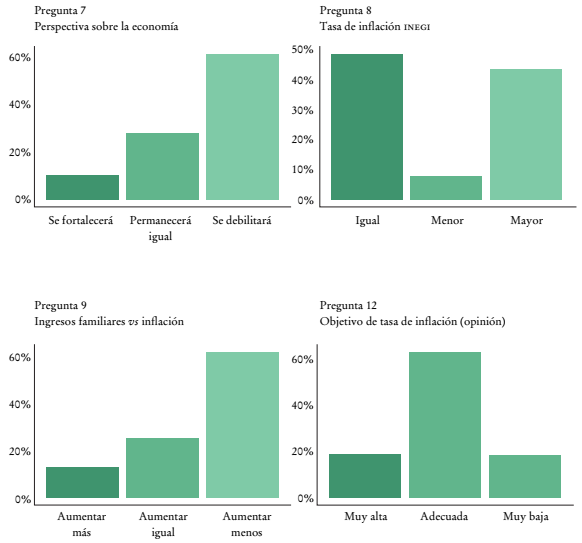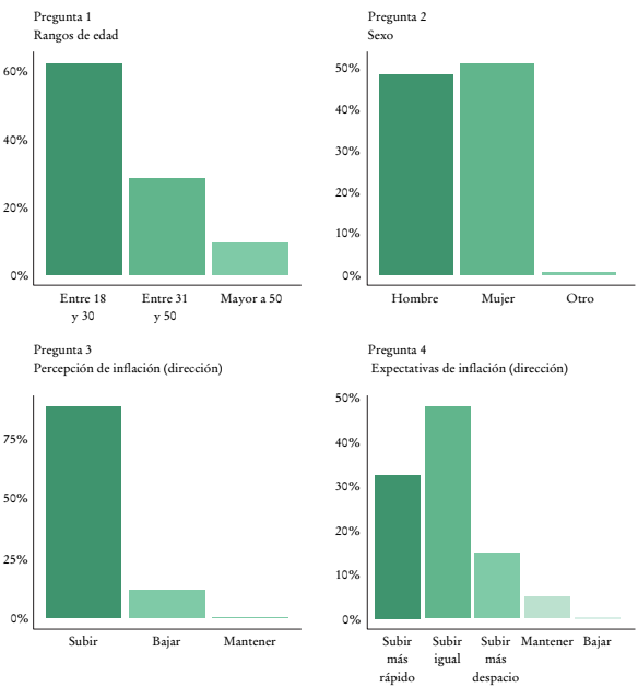 La encuesta que desarrollamos contiene 13 preguntas (algunas con varios reactivos) y se responde en cuatro a ocho minutos. Fue aplicada a 401 personas y los resultados del estudio son los siguientes: 1) se observan expectativas de inflación muy superiores a las de los expertos y con una gran dispersión entre ellas; 2) se observa un efecto importante de la información adicional proporcionada sobre las expectativas de los encuestados, en particular, comunicar sobre cifras de inflación pasada o de proyecciones futuras reduce las expectativas de inflación de los consumidores; 3) estas últimas dependen principalmente de la inflación de la categoría de alimentos, seguida por transporte y ropa, lo cual implica un reto importante para el banco central, ya que una parte importante de los alimentos forma parte del componente no subyacente de la inflación, que es más volátil y puede ser influido con menor probabilidad por las decisiones de política monetaria.
