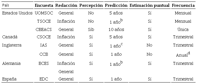 Las columnas de la tabla describen las características básicas de cada encuesta. La columna Redacción se refiere a la manera en la que están formuladas las preguntas de la encuesta sobre las expectativas de inflación: “inflación” quiere decir que la encuesta pregunta específicamente sobre la tasa de inflación en el país, “general” implica que pregunta sobre los precios en general (es decir, sin hacer uso de la palabra “inflación”). La mayoría de las encuestas usa una pregunta sobre precios en general. La columna Percepción indica si se pregunta o no sobre el cambio en precios en el último año. La mayoría de las encuestas sí incluye este tipo de pregunta. La columna Predicción (plazo) da cuenta de la cantidad de años en el futuro que se pide considerar para una predicción; si se piden estimaciones para distintos periodos sólo presentamos el más largo en el cuadro. La mayoría de las encuestas utiliza una predicción de un año en adelante. La columna Estimación puntual señala si la encuesta pide o no una estimación puntual del cambio en precios -en general, se pregunta también la dirección (subir o bajar) del cambio-. La mayoría sí pide una estimación puntual -también en el caso de Japón e Indonesia; véase Murillo Garza y Sánchez-Romeu (2014)-. La columna Frecuencia indica la periodicidad con la que se realizan las encuestas; la mitad son trimestrales.