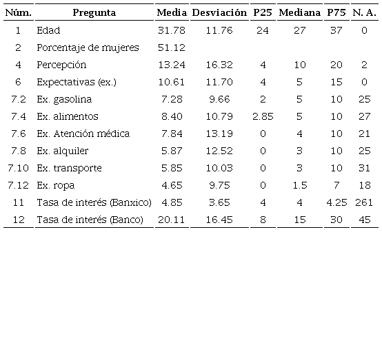 donde es la expectativa de inflación del participante i sobre el bien k; también incluimos como variables explicativas la percepción de inflación y la tasa de interés anual percibida que cobra un banco comercial (vector Ii), en tanto que W está definido igual que antes (variables de edad y género).