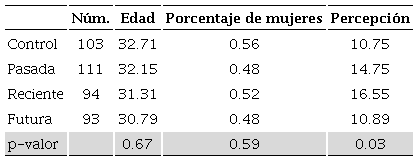 Tenemos pocas variables medidas antes de la intervención: edad, género y percepciones. Éstas se encuentran bien balanceadas entre los distintos tipos de intervención. Por ejemplo, el grupo con la mayor edad es el de control, con 32.7 años, y el menor es el que recibe la información futura, con 30.8 años. Por otro lado, el grupo que tiene más mujeres es el de control, con 56%, y el menor es el que recibe información sobre inflación pasada y futura, con 48%. El balance estadístico se puede confirmar al estimar una regresión de cada variable contra variables dicotómicas de las intervenciones. El valor-p de probabilidad con la hipótesis de que el coeficiente es el mismo entre intervenciones es 0.59 para edad, 0.68 para género y 0.03 para percepciones. Ninguna estimación tiene una significancia de menos de 1% (en el Apéndice 3 se incluye la evidencia correspondiente de esta prueba). Como ya se ha mencionado, las respuestas de percepción y expectativas integran algunos valores atípicos, por lo que, cuando estimamos una regresión cuantil en la mediana con controles de género y edad, las intervenciones no tienen ningún valor predictivo sobre las percepciones de inflación (valor-p de 0.48).