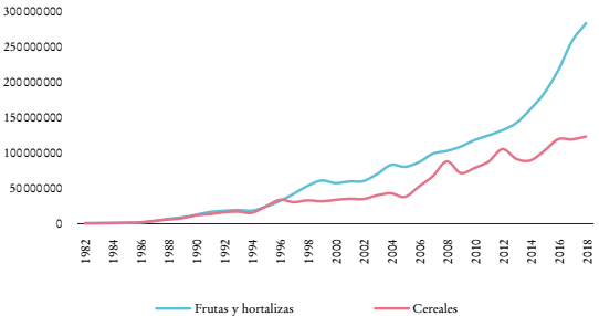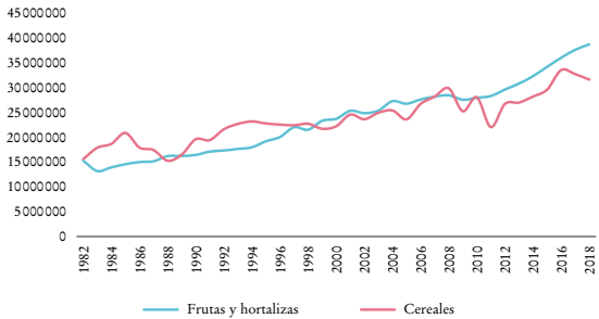 En la producción de frutas y hortalizas se registró una tasa de crecimiento medio anual de 3% durante 1982-2018, mientras que la producción de cereales se incrementó en 2%, a pesar de contar con una superficie promedio cosechada a nivel nacional casi seis veces mayor a la de las frutas y hortalizas (Gráficas 3 y 4).