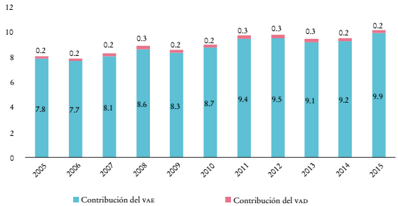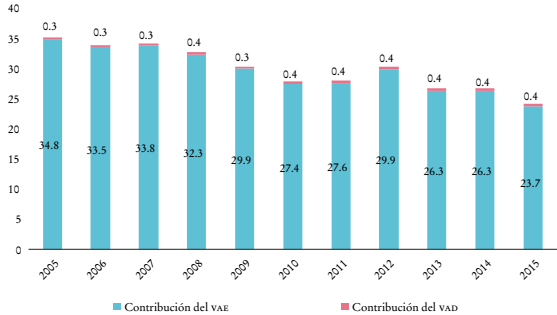 En la industria de alimentos, bebidas y tabaco, que conforma el sector agroalimentario manufacturero, se observa una situación aún más crítica en la participación dentro de las CVG, donde siguen dominando los encadenamientos hacia atrás de manera más acuciante. Mientras el VAE como porcentaje de las exportaciones brutas de este sector para 2015 se ubicó en 23.7%, el VAD contenido en las exportaciones mexicanas que será incorporado a otros procesos productivos en terceros países representó únicamente 0.4% (Gráfica 6). De esta manera, se puede observar que, a pesar de que el sector agroalimentario mantiene una baja participación en las CVG en comparación con otros sectores, nuevamente se perfila una vinculación con la cadena altamente dependiente de las importaciones de insumos con una baja capacidad para añadir valor.