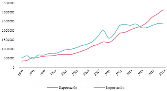 La entrada en vigor del TLCAN significó un rápido dinamismo comercial. Mientras que en 1994 las exportaciones mexicanas representaban 15% del producto interno bruto (PIB), para 2019 ya alcanzaban 35%. Asimismo, los Estados Unidos se posicionaron como el principal socio comercial de México, ya que 80% de las exportaciones nacionales se canalizó hacia ese país durante el mismo año.5 En cuanto a su composición, para 2020, 82% de las exportaciones correspondió a la industria manufacturera, particularmente en las ramas de: a) fabricación de equipos de computación, comunicación y medición; b) fabricación de accesorios, aparatos eléctricos y equipos de generación de energía eléctrica, y c) fabricación de equipos de transporte, como el ensamblaje de automóviles y camiones.