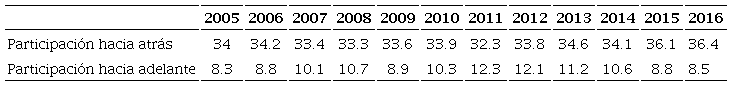 La metodología basada en el comercio en valor agregado vinculado con las CVG (OCDE, 2013; Conferencia de las Naciones Unidas sobre Comercio y Desarrollo [UNCTAD], 2013) permite abordar el análisis empírico de la naturaleza de la participación de los países en estas cadenas. Esto se sustenta en las exportaciones de un país que forman parte de un proceso comercial integrado globalmente a partir de dos componentes: el valor agregado extranjero (VAE) incorporado en las propias exportaciones, y el valor agregado doméstico (VAD) integrado en las exportaciones de otros países. Con base en ello, pueden diferenciarse dos tipos de participación en las CVG: 1) una participación hacia atrás o backward, caracterizada por un alto contenido de VAE en las exportaciones vinculadas con las CVG, lo que significa que una parte importante de las exportaciones brutas son insumos producidos en terceros países, y 2) una participación hacia adelante o forward, dominada por un elevado contenido de VAD en las exportaciones vinculadas con las CVG, valor que será incorporado como input en los productos de terceros países, para luego ser reexportados. Por lo tanto, al considerar estas diferentes formas de integración en las CVG, puede deducirse que una alta participación en la cadena no tiene por qué implicar elevados beneficios en términos de ingreso y riqueza (Banga, 2013; Baldwin y Lopez-Gonzalez, 2013; Ferrando, 2013; Banco Mundial y OCDE, 2017).