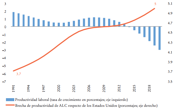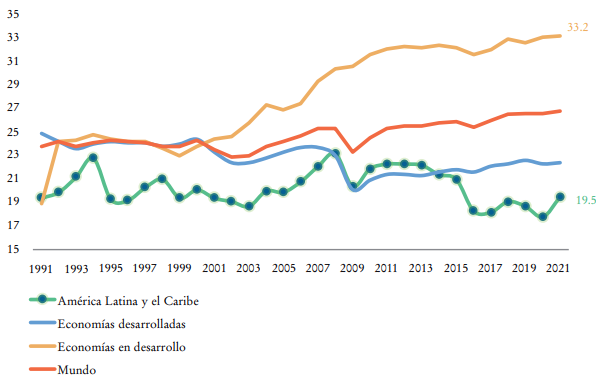 Nuestros dos grandes desafíos, ya lo dijo también el doctor Valenzuela, y gracias por plantearlo tan claramente, son la inversión y la productividad laboral (Gráficas 1 y 2). Respecto del comportamiento de la inversión en América Latina y el Caribe, nuestra tasa de inversión (ratio) es de 19.5% respecto del producto interno bruto (PIB), y cuando comparamos desde 1991 hasta 2021, vemos que la mejor etapa fue justamente en 2011, en las épocas más recientes, pero en este momento estamos en 19.5%, las economías en desarrollo están en 33.2% y el promedio mundial está alrededor de 26%. Somos la región que menos invierte de todo el mundo.