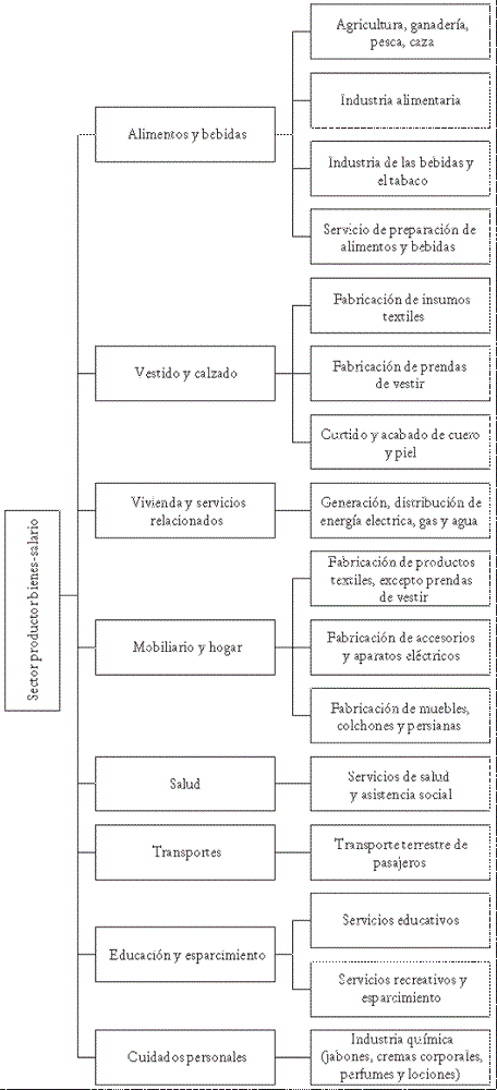 En tercer lugar, cada índice parcial está construido por subíndices (u otros índices parciales) que representan las ramas que producen los bienes de cada rubro del gasto (véase el diagrama 1). Por ejemplo, para el primer índice parcial, rubro del gasto (subsector) “alimentos y vestido”, está integrado por cuatro subíndices: 1) agricultura, cría y explotación de animales, aprovechamiento forestal, pesca y caza; 2) industria alimentaria; 3) industria de las bebidas y el tabaco, y 4) servicios de preparación de alimentos y bebidas. A fin de integrar el índice parcial se ponderó cada subíndice por el peso relativo de trabajo vivo de cada rama en el trabajo vivo total del subsector.