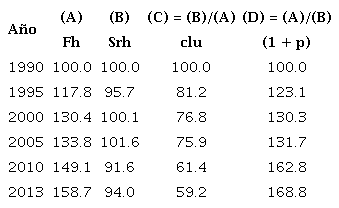 Por ejemplo, de 1990 a 1995 los salarios reales por hora cayeron en 3.3% y la productividad creció en 8.1%, lo que provocó una caída de 10.5% en el valor de la fuerza de trabajo. A fin de conocer el nivel de la fuerza de trabajo, se supone conocido el valor para el año inicial, en este caso era de 0.157, por lo que pasó a 0.140. Los datos para el periodo completo se presentan en el Cuadro 10.