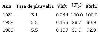 En el último año (1981) del modelo de sustitución de importaciones, la tasa de plusvalía se encontraba en 3.1 (Dardón, Valdivieso y Valenzuela, 1999). A finales de la década de los ochenta, después de cumplido el primer gobierno de corte neoliberal, la tasa de plusvalía alcanzaba un nivel de 5.5, o sea, se elevó en 77.4%. Esto significa que el valor hora de la fuerza de trabajo en 1981 era de 0.244, es decir, el obrero se apropiaba de 14 minutos con 38 segundos de la hora trabajada, mientras que en 1989 alcanzó un nivel de 0.153, es decir, se apropiaba de 9 minutos con 12 segundos de la hora trabajada.