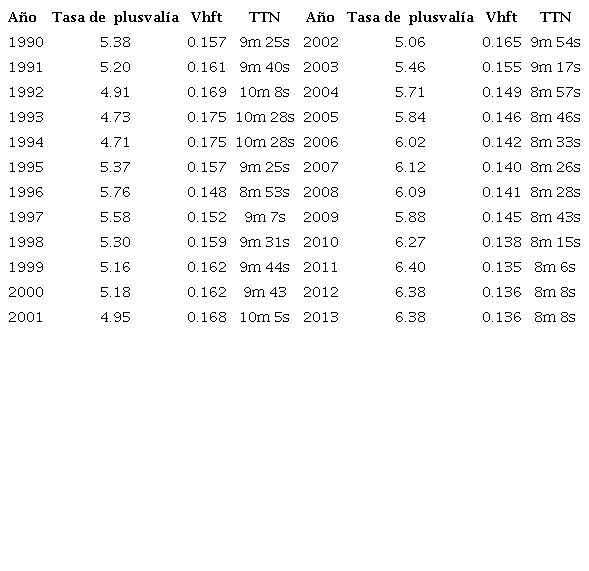 Esto significa que el valor de la fuerza de trabajo pasó de 0.157 en 1990 a 0.136 en 2013. O sea, el obrero se apropiaba de 9 minutos con 25 segundos en 1990, mientras que en 2013 de 8 minutos con 8 segundos. La información se presenta en el Cuadro 3.