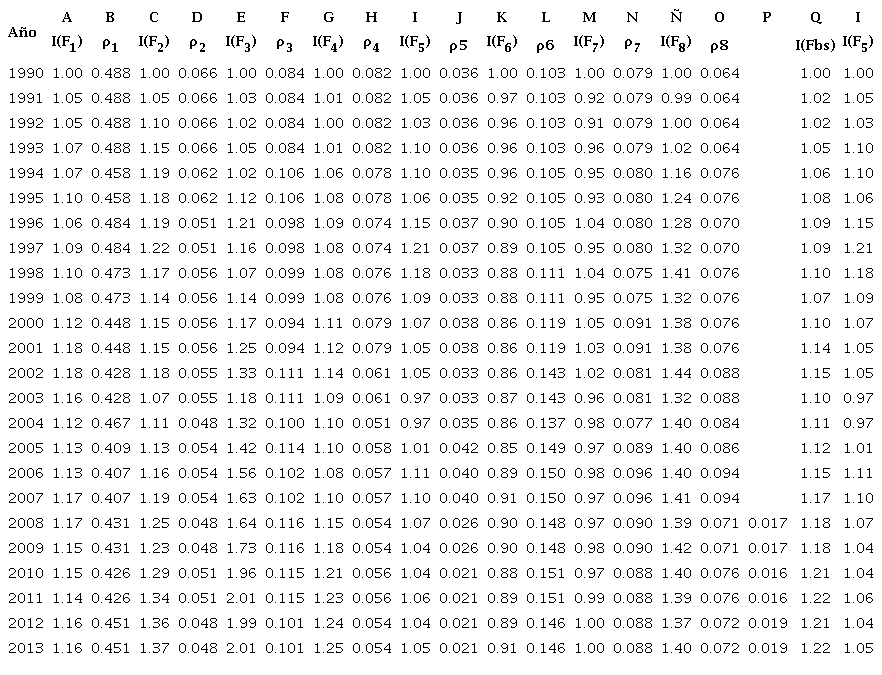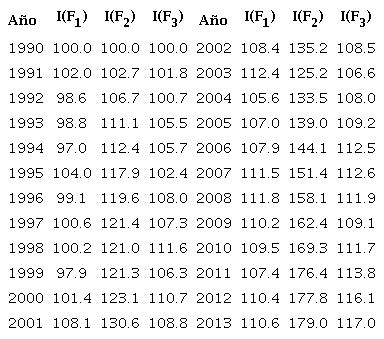 I(F1) es el índice de productividad del subsector 1: agricultura, cría y explotación de animales, aprovechamiento forestal, pesca y caza; I(F2) es el ín dice de productividad en electricidad, gas y agua, subsectores del 311 al 315 de la industria manufacturera; I(F3) es el índice de productividad en transportes, servicios educativos, servicios de salud; γ1 es el peso relativo del trabajo vivo del subsector 1 sobre el trabajo vivo total del sector de bienes-salario; γ2 es el peso relativo del trabajo vivo del subsector 2 sobre el trabajo vivo total del sector de bienes-salario; γ3 es el peso relativo del trabajo vivo del subsector 3 sobre el trabajo vivo total del sector de bienes-salario. Los resultados se presentan a continuación.