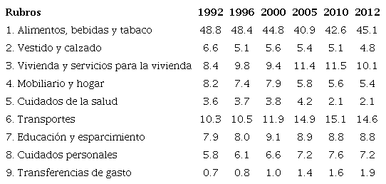 En primer lugar, revisamos la Encuesta Nacional de Ingreso Gasto de los Hogares (ENIGH) elaborada por el Instituto Nacional de Estadística y Geografía (INEGI). En los resultados de dicha encuesta aparecen los grandes rubros del gasto por decil de población (del más pobre al más rico). Tomamos del decil II al decil V, parte de la población donde con seguridad se encuentra la clase obrera mexicana.