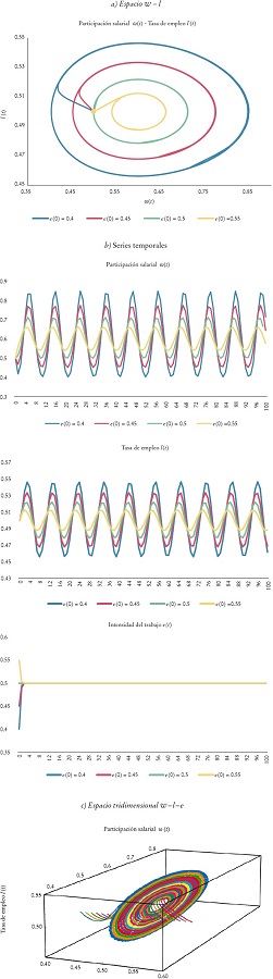 Si se combinan (6), (8), (19) y (20), se obtiene un sistema dinámico en tres dimensiones para la tasa de empleo, la participación salarial y la intensidad laboral:27