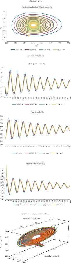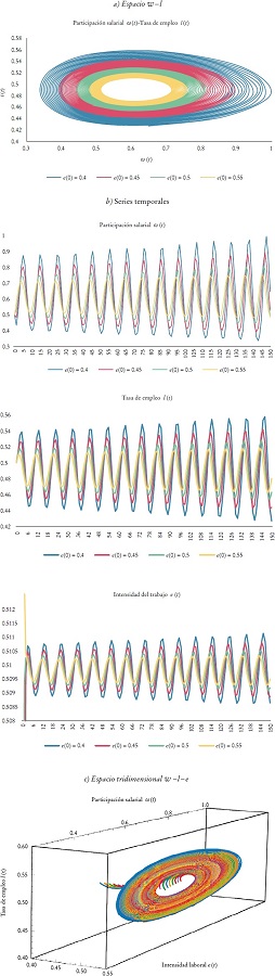 Este comportamiento -demostrado teóricamente- puede visualizarse con simulaciones numéricas.31 Por ejemplo, la Gráfica 1 presenta simulaciones para un caso extremo de ciclos límite (αw1 =αHBw1 ); emplea condiciones iniciales constantes para la participación salarial w y la tasa de empleo l, y cambia los valores iniciales de la intensidad laboral e. Esta gráfica sugiere que en el espacio w-l surgen ciclos límite que fluctúan alrededor del equilibrio (w*, l*) en sentido horario (similar al modelo de Goodwin), mientras que la intensidad converge monótonamente hacia su equilibrio (e*). Asimismo, en el espacio w-l se nota que, pese a tener siempre un mismo valor inicial en estas variables, los ciclos límite tienden a ampliarse cuando el valor inicial de la intensidad es menor, y en la mayoría de los casos el punto inicial no forma parte de los ciclos -a diferencia de Goodwin (1967), donde los valores iniciales siempre caen dentro de los ciclos-. Respecto de la representación tridimensional de las trayectorias (espacio w-l-e), desde los diferentes valores iniciales de la intensidad se converge en un “disco” que ilustra la estabilidad del modelo.