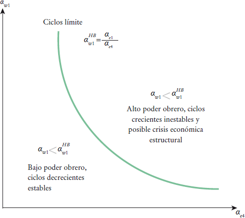 Desde estos resultados puede brindarse una interpretación global del vínculo entre el poder de negociación de las clases sociales y la estabilidad de los ciclos. En concreto, la expresión muestra que el valor crítico αHBw1 , en el cual se genera la bifurcación de Hopf, depende de la ratio entre el parámetro que representa el poder de los trabajadores para reducir la intensidad laboral (αe1) y uno de los parámetros que representa el poder capitalista para incrementar esa intensidad (αe4). Como se mencionó previamente, si aumenta el poder relativo de los capitalistas para incrementar la intensidad laboral en comparación con la clase obrera (cae la ratio αe1 /αe4), necesariamente cae αHBw1 , lo que implica que el poder obrero de negociación salarial estará limitado por un umbral más restrictivo a fin de que existan ciclos estables. Es decir, en este caso se requiere una clase trabajadora más débil para garantizar la estabilidad cíclica del capitalismo, como sugiere la Gráfica 4. En el caso contrario, si el poder obrero de negociación salarial es “demasiado alto” (αw1 > αHBw1), surgen ciclos de amplitud creciente hasta que el modelo colapsa por una dinámica explosiva. En otras palabras, un excesivo poder obrero puede generar una crisis económica estructural: una interrupción de la reproducción capitalista que sólo puede superarse con un cambio exógeno en las estructuras de poder (representadas en los parámetros α del modelo). Cabe notar que esta tendencia es distinta a las crisis económicas periódicas generadas por los ciclos endógenos previamente analizados.