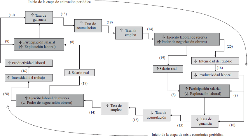 Al tomar como referencia interpretaciones preliminares (Cajas Guijarro, 2018a), la Gráfica 1 sugiere que la acumulación capitalista genera ciclos endógenos que fluctúan entre etapas de animación y de crisis económicas periódicas (Marx, 2009a: 787). Así, en la animación periódica existe una elevada tasa de ganancia (↑r) y, por ende, una tasa de acumulación alta (↑γ) que amplía con fuerza el empleo (↑l) y reduce el peso del ejército laboral de reserva, lo que incrementa el poder obrero para exigir un mayor salario real (↑w) y menor intensidad laboral (↓e) -y menor productividad (↓q)-, movimientos que incrementan la futura participación salarial (↑w) -y reducen la explotación laboral-.32 Como resultado, en periodos posteriores la tasa de ganancia decae (↓r) e inicia una crisis económica periódica, pues se debilita la tasa de acumulación (↓γ), lo que atenúa al empleo (↓l), e incrementa así el peso del ejército de reserva y reduce el poder de negociación obrero; ello facilita la reducción del salario real (↓w) y el incremento de la intensidad laboral (↑e) -y de la productividad (↑q)-, lo cual reduce la participación salarial (↓w) -e incrementa la explotación- hasta que la futura tasa de ganancia se recupera (↑r) y arranca una nueva etapa de animación. Este proceso cíclico se resume en el Diagrama 1, donde los números entre paréntesis indican las ecuaciones que sustentan el vínculo entre cada variable.