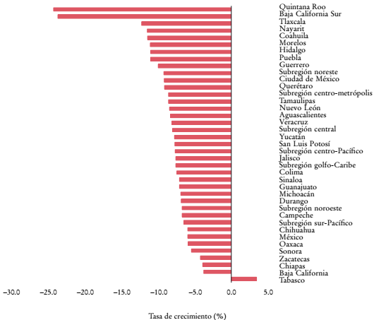 La Gráfica 1 muestra la caída del PIB a nivel de subregión y entidad federativa en 2020. La región central fue la que sufrió el mayor impacto, con una caída de 8.2%, mientras que el norte y el sur cayeron 7.9 y 6.9%, respectivamente. No obstante, a nivel de subregión, las más vinculadas con el turismo fueron las que experimentaron un mayor impacto. La península de Yucatán cayó 16.3%, debido a un decrecimiento de 24.1% en Quintana Roo, y la península de Baja California-Litoral Pacífico sufrió un desplome de 11.7%, por una reducción de 23.5% en Baja California Sur. En la Gráfica 1 también se advierten asimetrías intrarregionales, por ejemplo, Quintana Roo (estado que más decreció) y Tabasco (el único que creció) pertenecen a la región Sur, y Baja California Sur (el segundo que más decreció) y Baja California (el que menos decreció) pertenecen a la región norte.